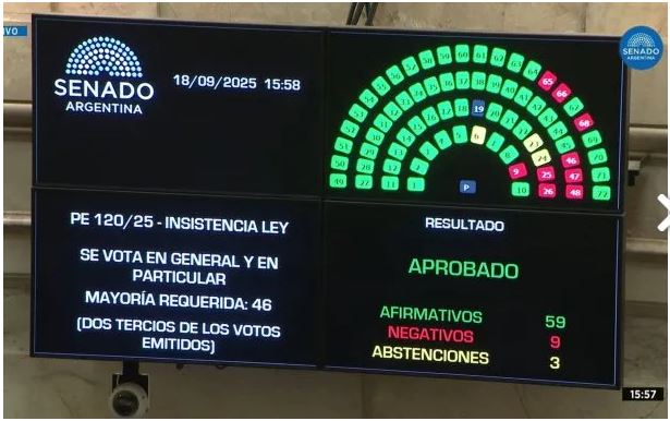 Con un oficialismo sin posibilidad de defensa y una Casa Rosada que casi ni se movió de su postura original, la oposición senatorial rechazó esta tarde el veto presidencial a la ley que impone giros automáticos de Aportes del Tesoro Nacional (ATN) a las 23 provincias y la Ciudad de Buenos Aires. Sobraron los dos tercios de votos requeridos para la insistencia de la norma: 59 a favor, nueve en contra y tres abstenciones, y la definición queda ahora en manos de Diputados.