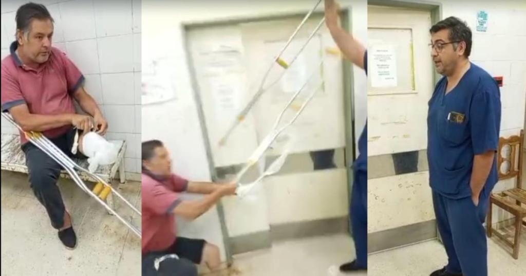 En medio de la discusión, el paciente se retiró los vendajes e insistió en que lo asistieran. Acto seguido, fuera de sí, arrojó las muletas hacia el profesional, que pidió la intervención policial. En ese momento, su hijo se interpuso y le aplicó una cachetada, hecho que ahora quedó confirmado por las nuevas imágenes de seguridad.