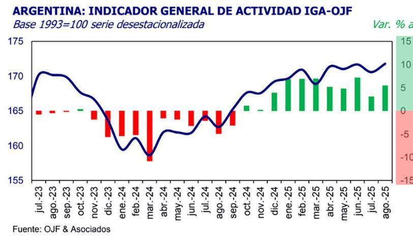 De acuerdo con el Índice General de Actividad (IGA) elaborado por el estudio OJF de Orlando Ferreres, en los primeros ocho meses del año la economía acumuló una expansión del 5,8% interanual. El informe destaca que la suba de 5,5% anual fue superior a la del mes anterior, con impulso de la intermediación financiera, el comercio mayorista, la industria manufacturera y la actividad minera.
