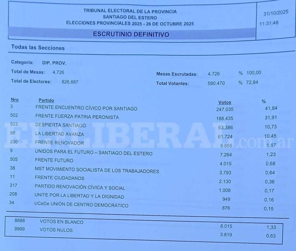 En la categoría de diputados provinciales, el Frente Cívico también se impuso con 247.035 votos (41,84%), seguido por el Frente Fuerza Patria Peronista, con 188.435 (31,91%), y Despierta Santiago, con 63.386 (10,73%).