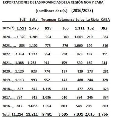 La provincia de Santiago del Estero cierra el año 2025 como la mayor exportadora de todo el Noroeste y en el noveno puesto entre las que más ingresaron dólares por sus ventas externas a lo largo de este año, de acuerdo con los datos aportados por el Indec sobre el Origen provincial de las Exportaciones por regiones económicas y por jurisdicciones, al que tuvo acceso EL LIBERAL.