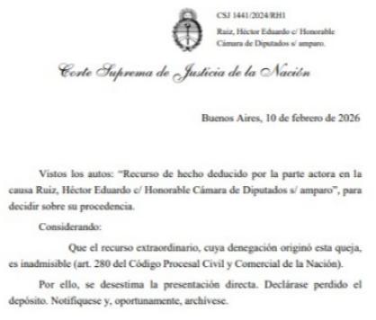 En la resolución de fecha martes 10 de febrero, el máximo tribunal del país señaló: Vistos los autos: "Recurso de hecho deducido por la parte actora en la causa Ruiz, Héctor Eduardo c/ Honorable Cámara de Diputados s/ amparo", para decidir sobre su procedencia. Considerando: Que el recurso extraordinario, cuya denegación originó esta queja, es inadmisible (art. 280 del Código Procesal Civil y Comercial de la Nación). Por ello, se desestima la presentación directa. Declárase perdido el depósito. Notifíquese y, oportunamente, archívese".