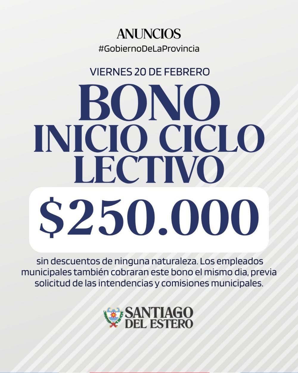 4.El primer bono previo al inicio del ciclo lectivo será abonado el próximo viernes 20 de febrero, por la suma de $250.000 sin descuentos de ninguna naturaleza. Los empleados municipales también cobraran este bono el mismo dia, previa solicitud de las intendencias y comisiones municipales.