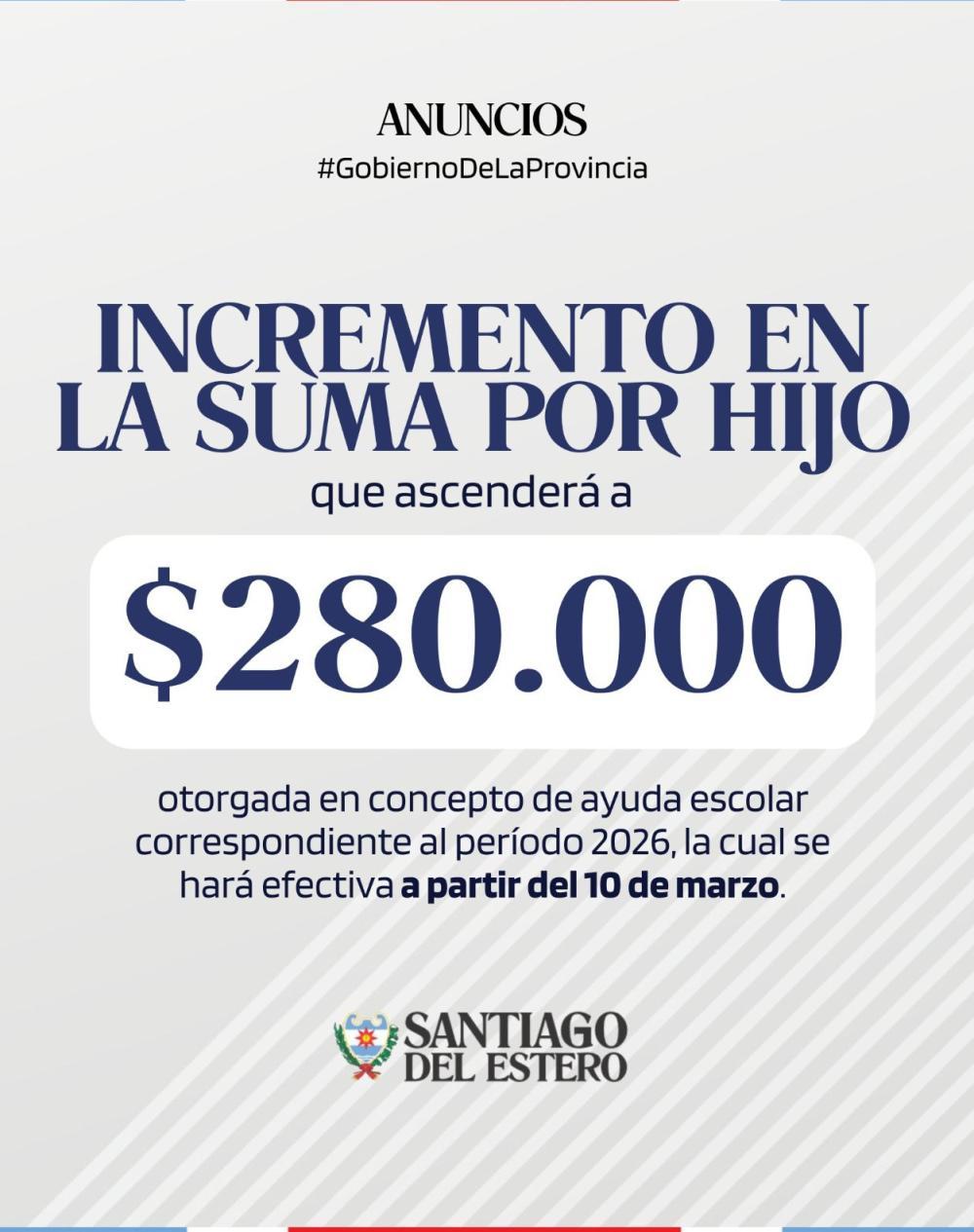 5.Incremento en la suma por hijo, que ascenderá a $280.000, otorgada en concepto de ayuda escolar correspondiente al período 2026, la cual se hará efectiva a partir del 10 de marzo.