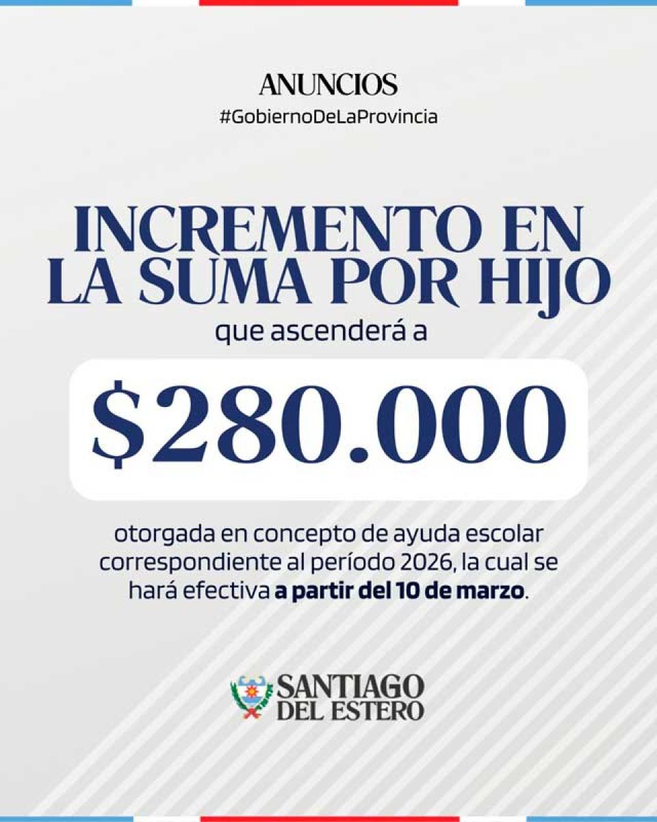 El gobernador Elías Suárez anunció un incremento en la suma por hijo correspondiente a la ayuda escolar 2026, que ascenderá a $280.000. El beneficio comenzará a hacerse efectivo a partir del 10 de marzo, en el marco de las medidas destinadas a acompañar a las familias de la administración pública en el inicio del ciclo lectivo.