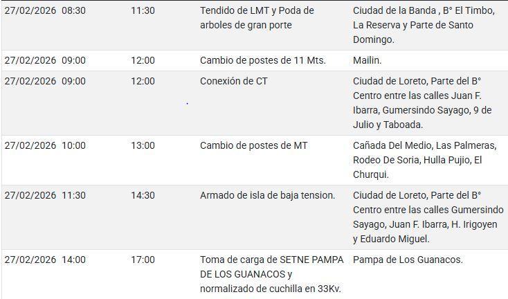 Tiempo de lectura: 19 segundos27/02/202607:11 Santiago- Lo que debes tener en cuenta.Este viernes 27 de febrero se realizarán cortes programados de energía eléctrica en Santiago del Estero. La medida forma parte de tareas de mantenimiento y trabajos técnicos que la empresa distribuidora ejecutará para mejorar el servicio en distintos sectores de la provincia. Se recomienda a los vecinos tomar las precauciones necesarias y prever las interrupciones durante el lapso indicado.