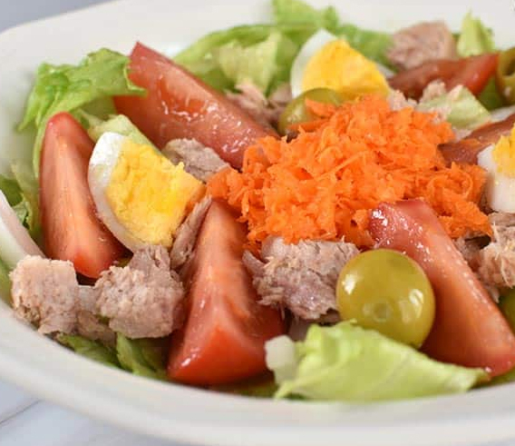 - En un plato grande o fuente distribuimos la lechuga cortada y escurrida, media cebolla previamente cortada en juliana, los trozos de tomate, las aceitunas, la zanahoria rallada, el atún en aceite previamente escurrido y desmigado y los huevos cocidos troceados.