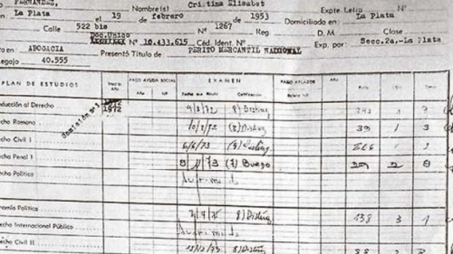 La ex presidenta Cristina Kirchner se graduó como abogada en octubre de 1979, luego de haber comenzado la carrera de Ciencias Jurídicas y Sociales en la Universidad Nacional de La Plata en 1972. Así lo refleja la copia del certificado analítico de estudios en el que figuran todas las materias que aprobó hasta convertirse en abogada. La discusión acerca de la veracidad del título de abogada de la ex mandataria se reavivó en los últimos días cuando el ex integrante del Superior Tribunal de Corrientes Ernesto Reggi presentó una denuncia en la Justicia federal. El denunciante señaló que la ex presidenta como señalaban denuncias anteriores- pudo haber incurrido en el delito de usurpación de títulos. Y agregó otra acusación: si se comprobase que no es abogada, debía ser procesada por defraudación contra la administración pública por el plus recibido por el título durante los años que ejerció cargos públicos. El caso le tocó por sorteo al juez Claudio Bonadio. La relación entre Cristina Kirchner y este juez no podría calificarse como amistosa. Fue Bonadio el primer juez federal en citar a indagatoria y procesarla por el caso conocido como "dólar a futuro". También quien, en 2015, allanó las oficinas de la empresa Hotesur en la causa en la que el magistrado investigaba por lavado de dinero a las empresas de Lázaro Báez y la firma hotelera de los Kirchner. Una operación políticojudicial del kirchnerismo sacó a Bonadio de la causa. Semanas después, la entonces Presidente aludió, sin nombrarlo, al magistrado cuando dijo no temer a un juez "pistolero, mafioso o extorsionador". En los últimos tiempos pidió el juicio político ante el Consejo de la Magistratura . Bonadio interviene junto al fiscal Carlos Rívolo en la última denuncia sobre el título de abogada. Ambos tienen a su cargo el caso por el que se la investiga por la sociedad "Los Sauces" y el cobro de alquileres. Rívolo, en el caso del título, pidió medidas previas antes de decidir si realiza alguna imputación. Solicitó a la Universidad de La Plata tanto el acta donde se dejó constancia de la expedición del título como el certificado analítico. 06/06/2016
